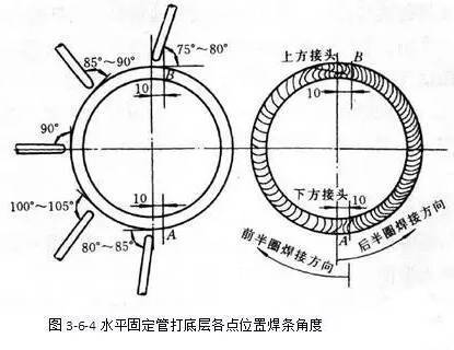 各點(diǎn)位置焊條角度如圖3-6-4及3-6-5所示。前半圈與后半圈相對(duì)應(yīng)的焊接位置,焊條角度相同。