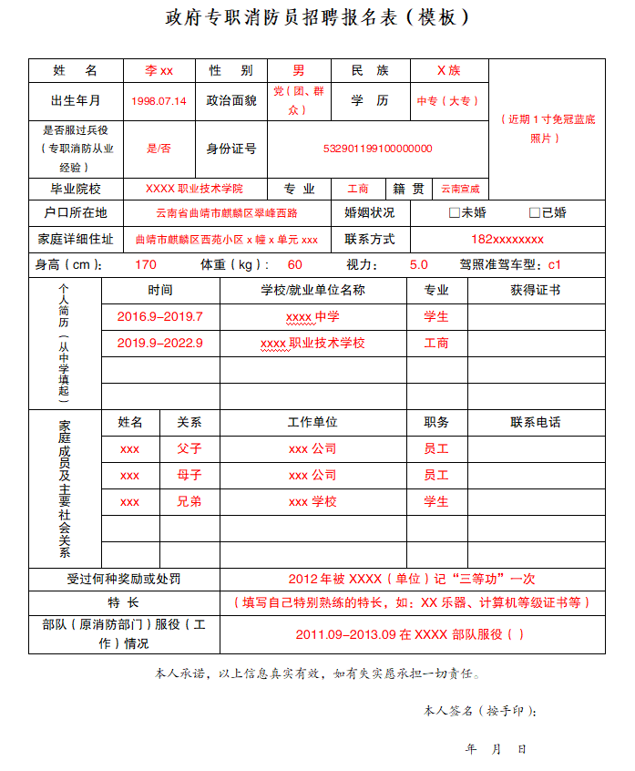 1> 報(bào)名地點(diǎn)及所需材料:曲靖經(jīng)開區(qū)消防救援大隊(duì)三樓站辦公室(曲靖市麒麟?yún)^(qū)翠峰西路66號)。應(yīng)聘人員提前通過下發(fā)二維碼下載填寫《政府專職消防員報(bào)名表》,并攜帶①本人身份證②學(xué)歷證書③復(fù)員、退伍軍人相關(guān)證明等材料原件(原件供報(bào)名時(shí)審驗(yàn))、復(fù)印件④近期正面免冠藍(lán)底1寸彩照⑤無犯罪記錄證明。