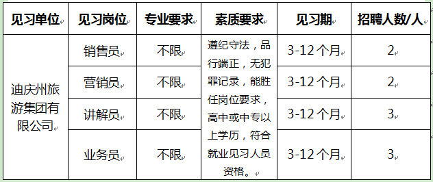 迪慶州旅游集團(tuán)設(shè)置就業(yè)見習(xí)崗位10個(gè),擬招聘青年就業(yè)見習(xí)人員10人(詳見下表)。