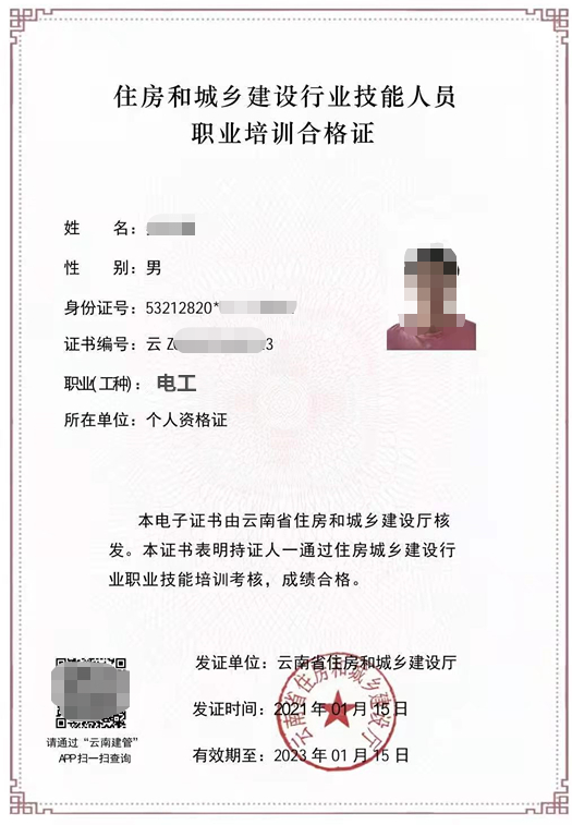 1、建筑電工證,由“云南住房和城鄉(xiāng)建設廳”頒發(fā),證書每2年進行一次“再教育繼續(xù)學習”,如果證書過期將需要重新考取!